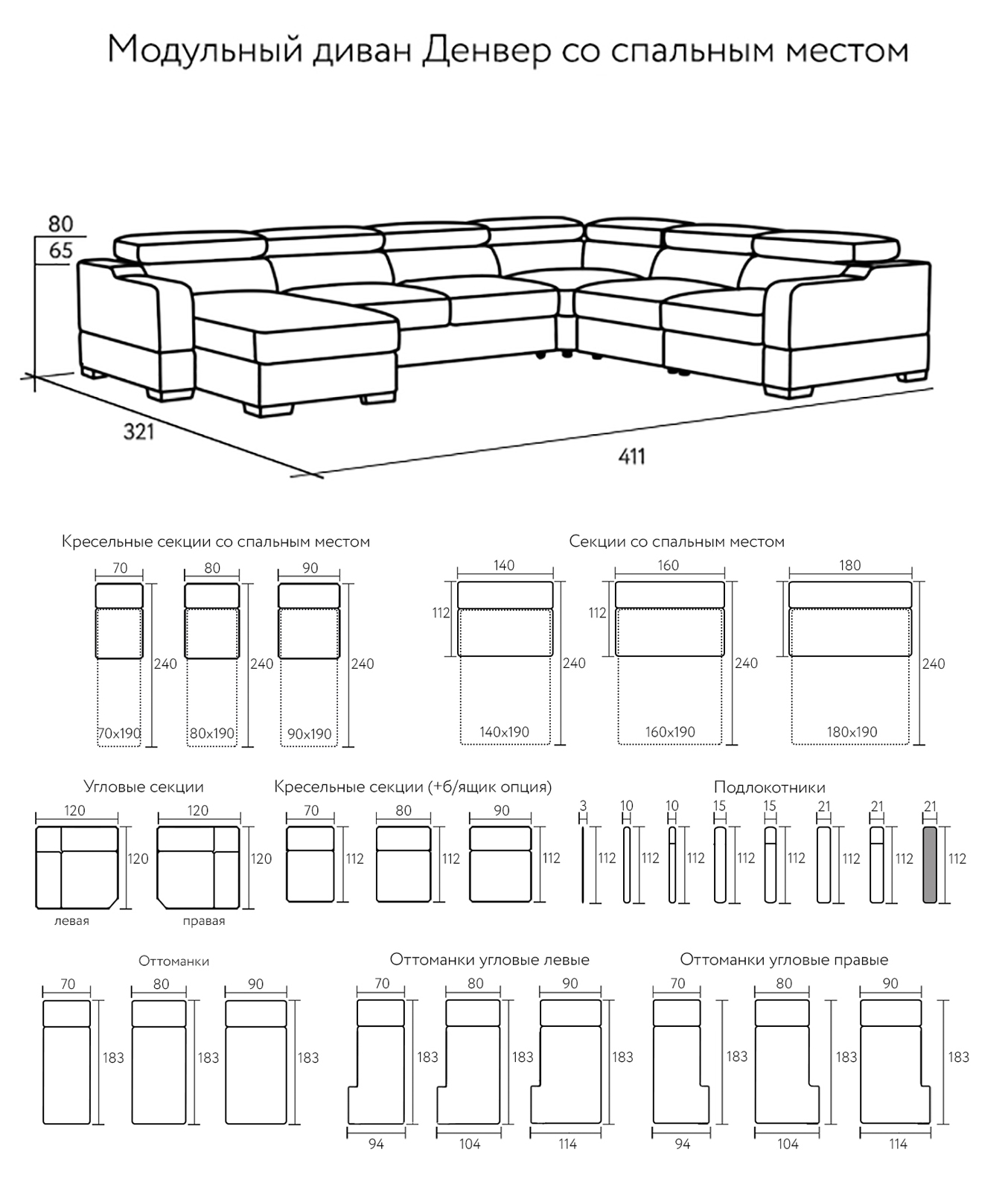 Основа спального дивана Денвер - высоковыкатной механизм трансформации. Простой и надежный в повседневном использовании он обеспечит вас идеально ровным спальным местом средней жесткости. Предусмотрено 6 вариантов ширины спального места от 70 до 180 сантиметров, глубина спального места одинакова для всех вариантов и составляет 190 сантиметров. Глубина модулей с разложенным спальным местом составляет 240 сантиметров.
