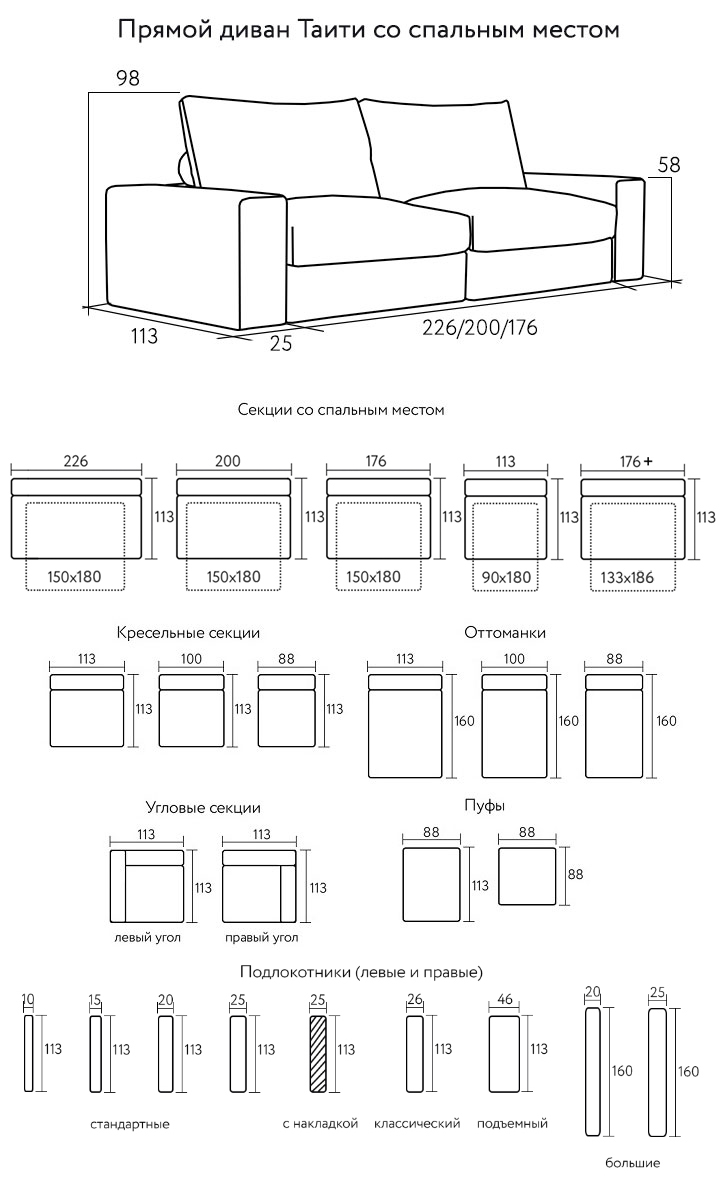 - классический 26х113х58 см - высокий подлокотник закругленной формы;