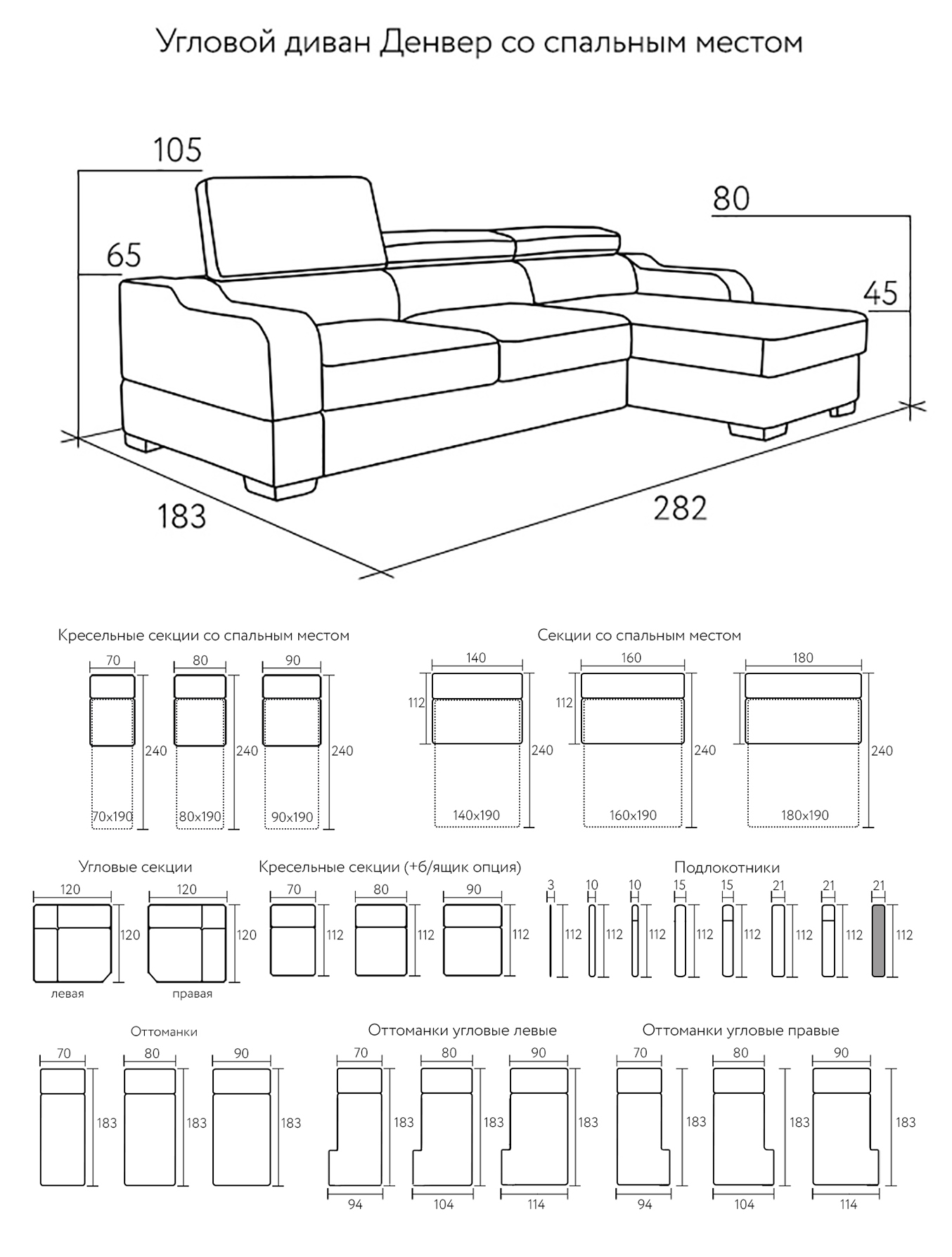 Основа спального дивана Денвер - высоковыкатной механизм трансформации. Простой и надежный в повседневном использовании он обеспечит вас идеально ровным спальным местом средней жесткости. Предусмотрено 6 вариантов ширины спального места от 70 до 180 сантиметров, глубина спального места одинакова для всех вариантов и составляет 190 сантиметров. Глубина модулей с разложенным спальным местом составляет 240 сантиметров.