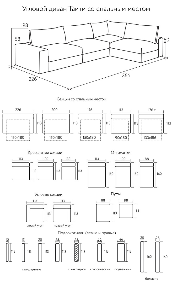 Два варианта угловых секций (113х113 см), позволяющих создать угловой диван правой и левой ориентации.