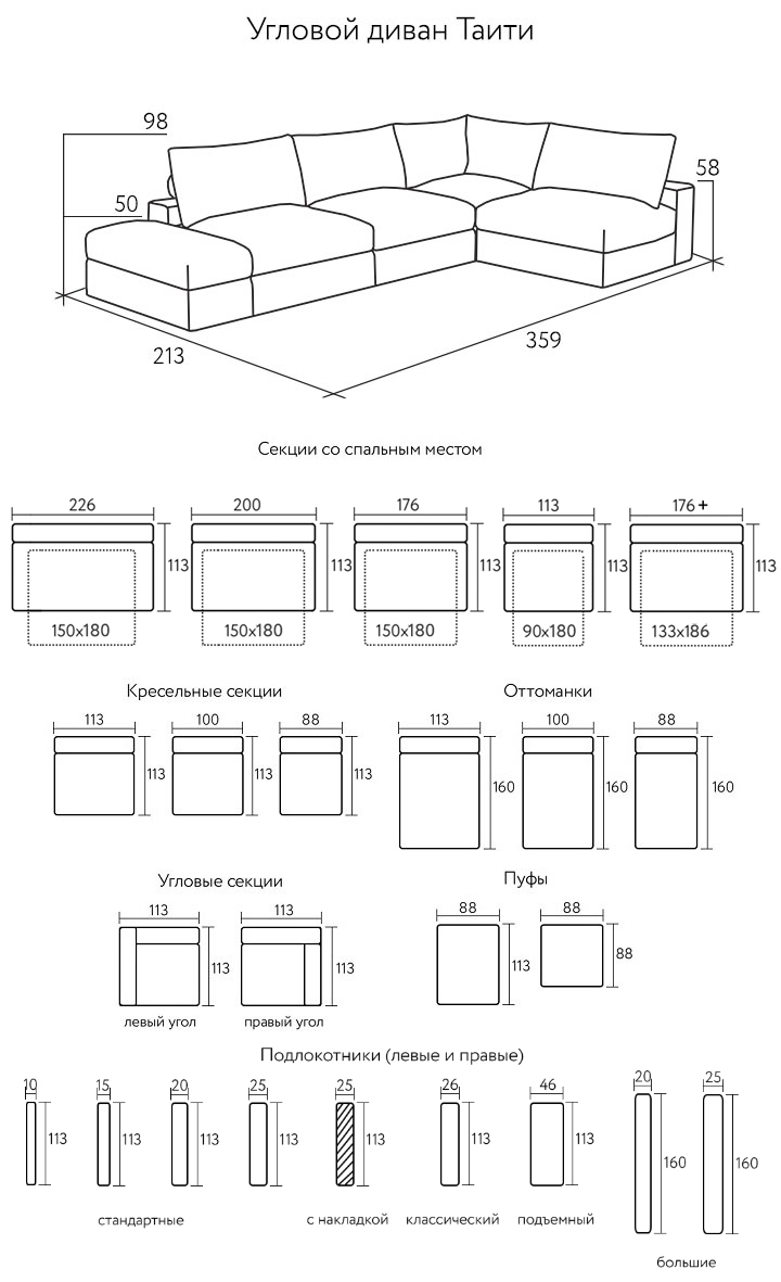 Два варианта угловых секций (113х113 см), позволяющих создать угловой диван правой и левой ориентации.