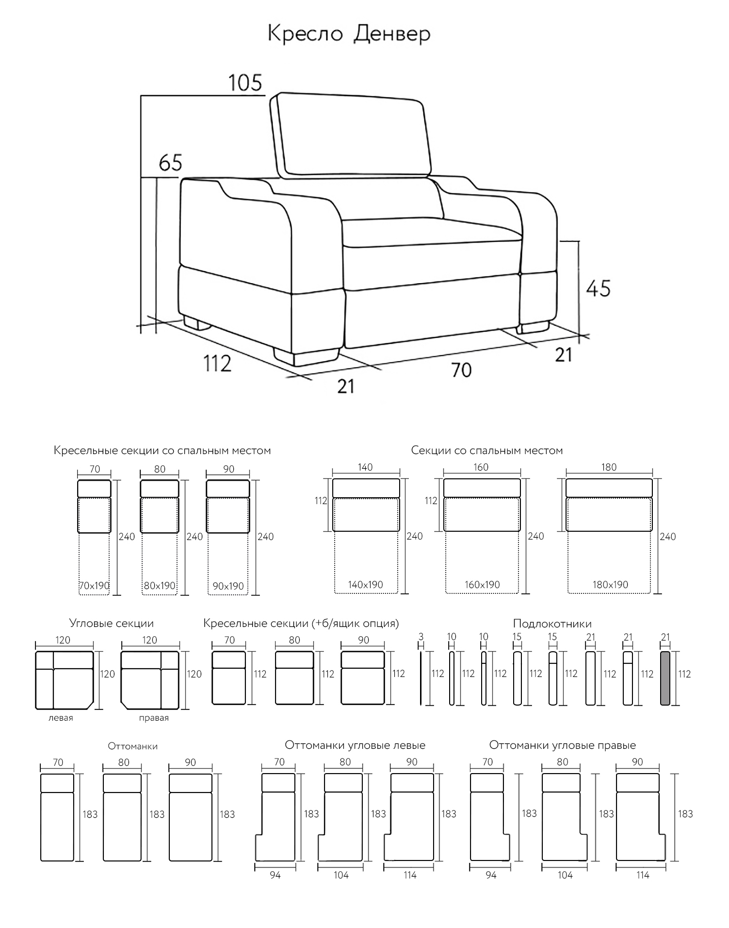 Основа спального дивана Денвер - высоковыкатной механизм трансформации. Простой и надежный в повседневном использовании он обеспечит вас идеально ровным спальным местом средней жесткости. Предусмотрено 6 вариантов ширины спального места от 70 до 180 сантиметров, глубина спального места одинакова для всех вариантов и составляет 190 сантиметров. Глубина модулей с разложенным спальным местом составляет 240 сантиметров.