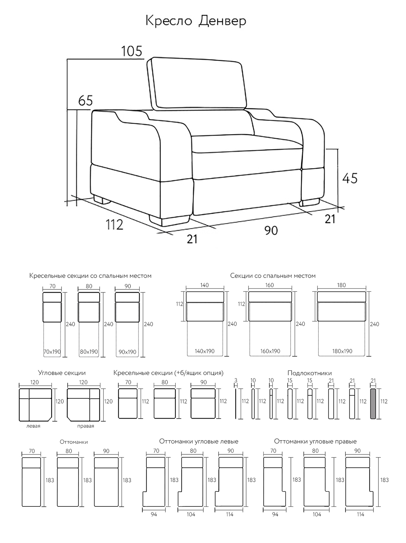 Основа спального дивана Денвер - высоковыкатной механизм трансформации. Простой и надежный в повседневном использовании он обеспечит вас идеально ровным спальным местом средней жесткости. Предусмотрено 6 вариантов ширины спального места от 70 до 180 сантиметров, глубина спального места одинакова для всех вариантов и составляет 190 сантиметров. Глубина модулей с разложенным спальным местом составляет 240 сантиметров.